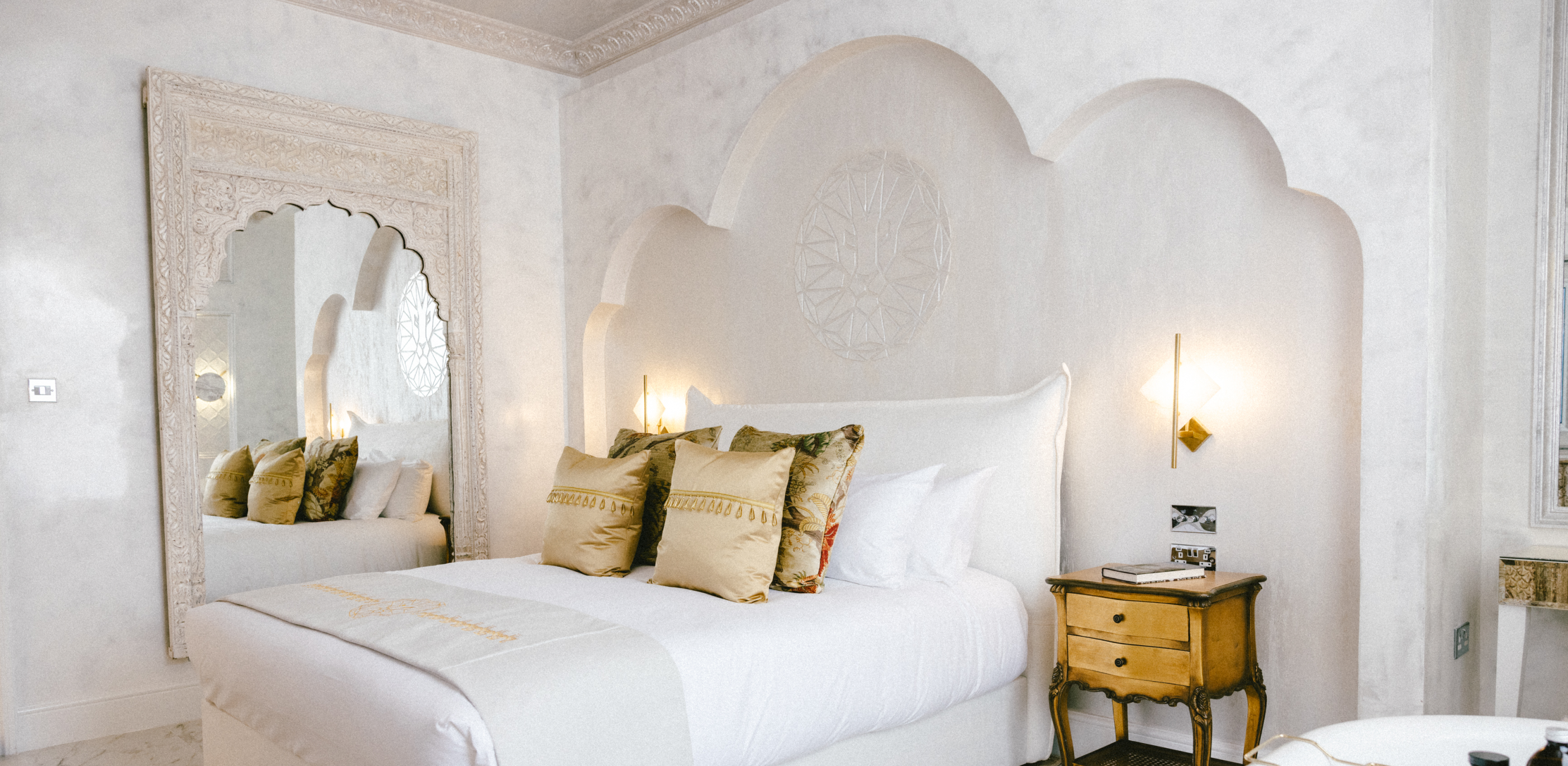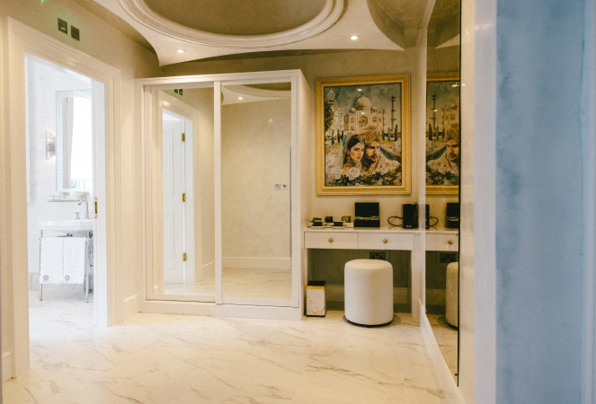 Immerse yourself in the splendour of the Taj Mahal Room at Baloci Boutique Hotel, where the delicate artistry of one of the world’s most iconic monuments is reflected in every detail. The room’s decor, inspired by the intricate marble inlay and majestic carvings of the Taj Mahal, creates a serene and luxurious atmosphere. Opulent white tones complemented by subtle Mughal architectural accents invite you to a peaceful retreat.
